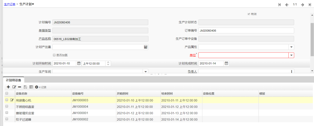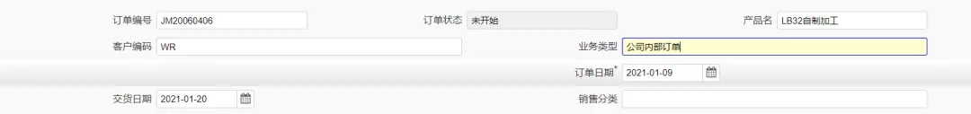 創(chuàng)建產(chǎn)品名稱為L(zhǎng)B32自制加工的化工產(chǎn)品生產(chǎn)訂單,其中訂單日期為2021-01-09,交貨日期為2021-01-20。如下圖所示: