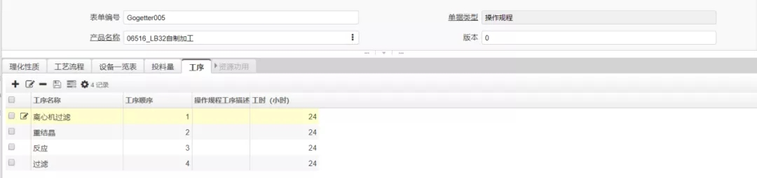 產(chǎn)品LB32自制加工的生產(chǎn)工序要求如下所示,需要4個(gè)工序,每個(gè)工序24小時(shí),也就是1天。每個(gè)工序?qū)?yīng)該工序的所需操作功用,按照工序順序依次分別為吊帶離心、不銹鋼結(jié)晶、搪玻璃反應(yīng)、柱子過(guò)濾。