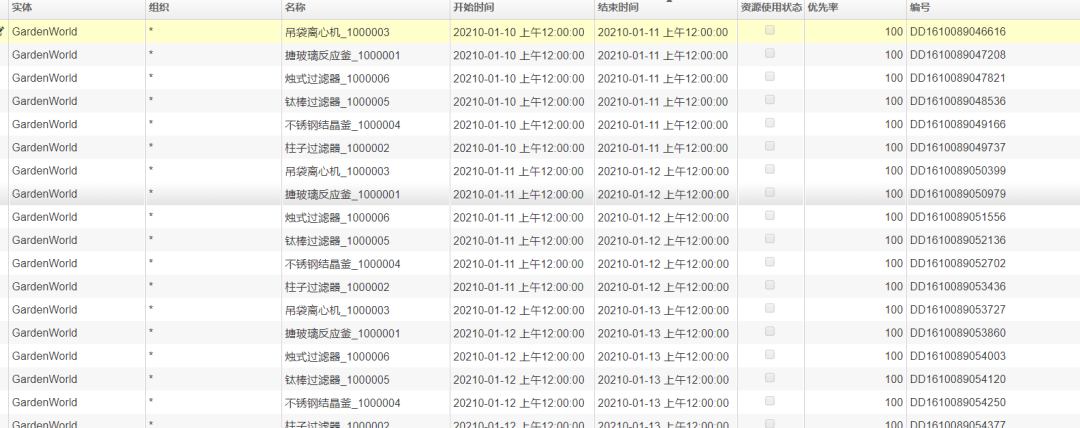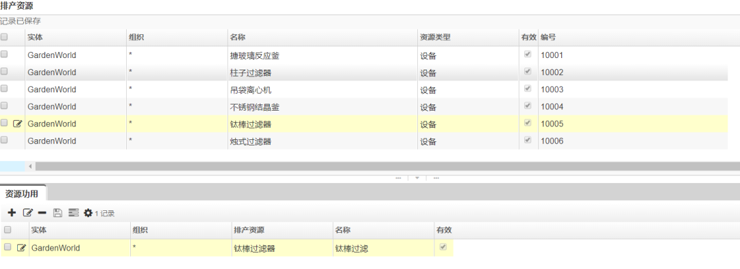 可用的排產(chǎn)資源如下圖,設(shè)備提供的資源功用分別對(duì)應(yīng)如下:搪玻璃反應(yīng)釜---搪玻璃反應(yīng)、柱子過(guò)濾器---柱子過(guò)濾、吊帶離心機(jī)--吊帶離心、不銹鋼結(jié)晶釜---不銹鋼結(jié)晶、鈦棒過(guò)濾器---鈦棒過(guò)濾、燭式過(guò)濾器---燭式過(guò)濾。
