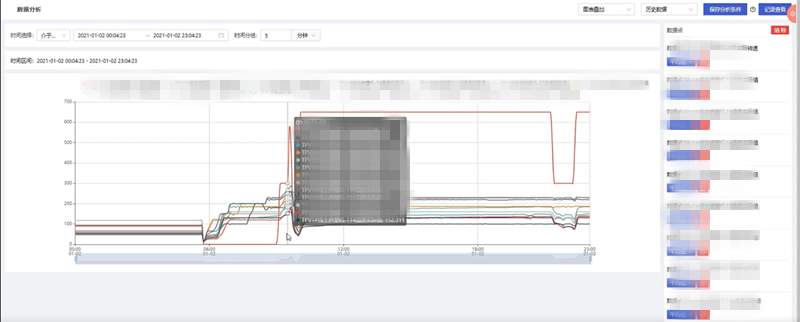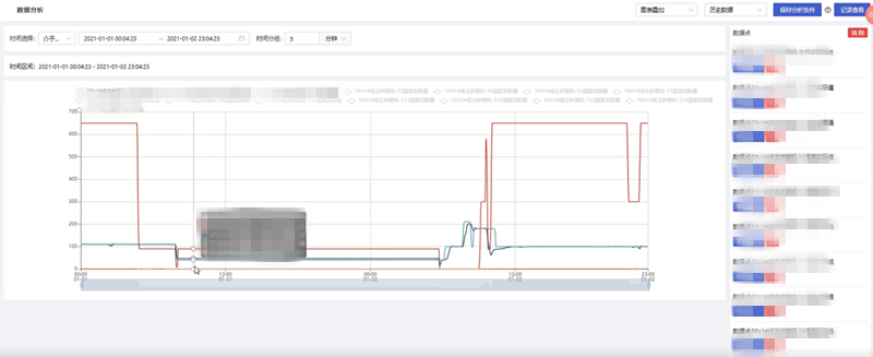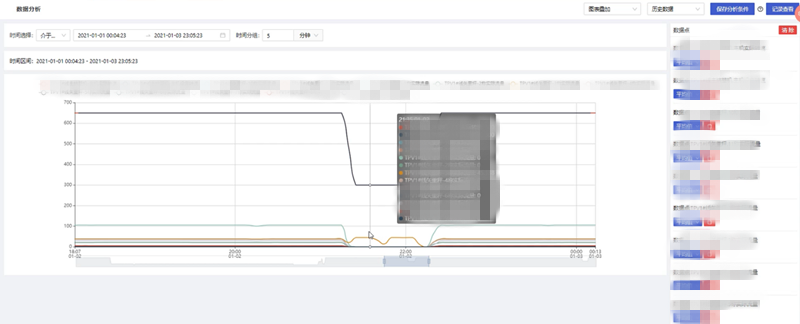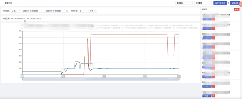 根據用戶的需要,對一段時間內的歷史數據或實時數據按照一定的統計頻率進行多個維度的數據分析,統計頻率包含不限、10秒、30秒、10分鐘、30分鐘、1小時,通過添加變量操作,在彈出的變量選擇彈窗中可多選數據點信息進行分析;數據分析得到的圖表顯示形式包括折線圖以及表格形式。多個數據點信息圖表的展示形式包括平鋪、疊加、標簽顯示以及合并表格顯示,根據不同的需求選擇對應的展示形式,靈活性高。