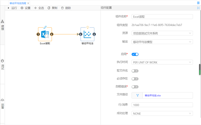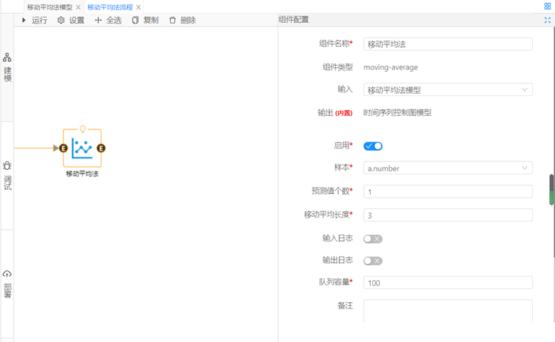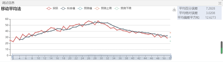 ②使用集成好算法的移動(dòng)平均法組件對數(shù)據(jù)進(jìn)行預(yù)測,對組件參數(shù)進(jìn)行設(shè)置,樣本設(shè)置為number,預(yù)測值個(gè)數(shù)設(shè)置為1,移動(dòng)平均長度設(shè)置為3,單擊運(yùn)行,從調(diào)試面板中查看分析結(jié)果。