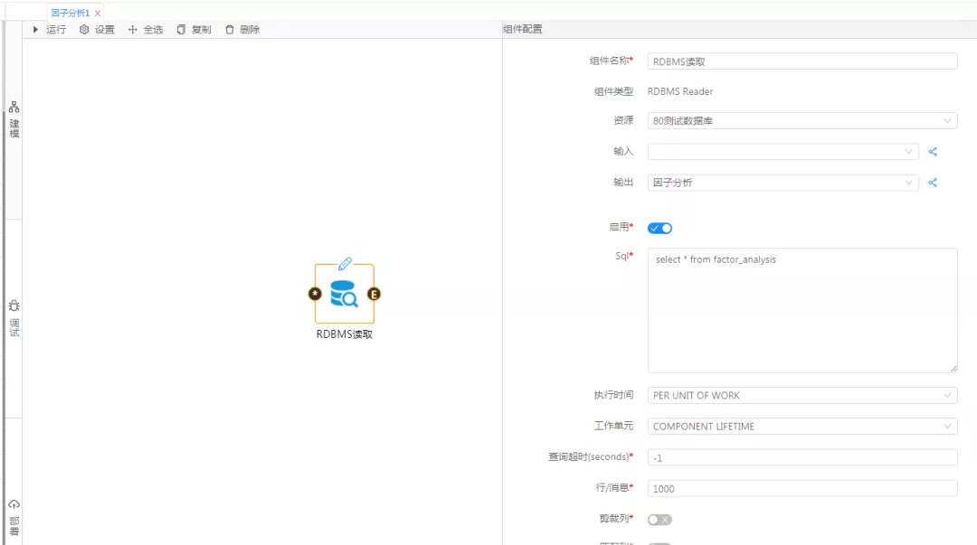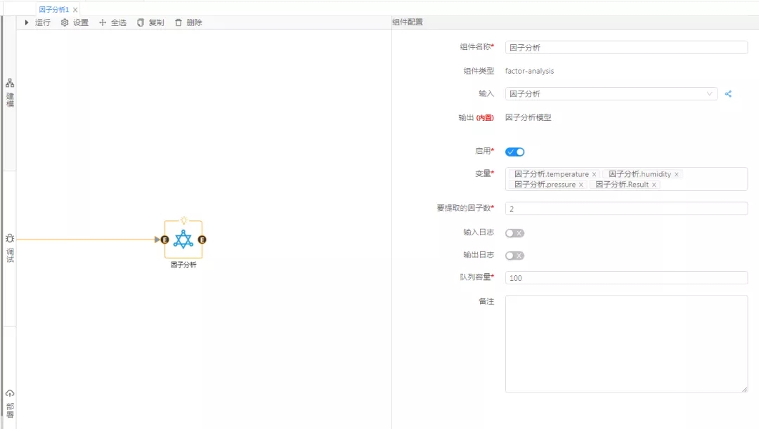 使用集成好算法的因子分析組件進(jìn)行數(shù)據(jù)的因子分析處理,對(duì)組件參數(shù)進(jìn)行設(shè)置,變量字段配置為溫度、濕度、壓強(qiáng)、實(shí)驗(yàn)結(jié)果,因?yàn)楣灿?/span>4個(gè)變量,所以要提取的因子數(shù)配置為2,單擊運(yùn)行,從調(diào)試面板中查看分析結(jié)果。