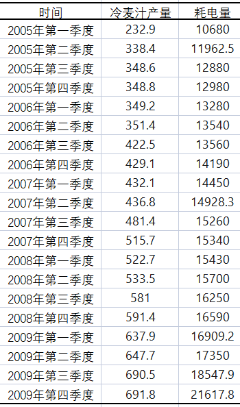 對(duì)于啤酒生產(chǎn)企業(yè),控制能源消耗是生產(chǎn)管理的重要部分。制冷耗電量是啤酒生產(chǎn)最大的能源消耗之一,占啤酒企業(yè)耗電量的43%左右。怎樣降低能源消耗, 加大成本控制力度是啤酒企業(yè)搞好生產(chǎn)管理的首要問題。為此本案例將驗(yàn)證冷麥汁的產(chǎn)量和制冷耗電量是否存在因果關(guān)系。從而為減少能源消耗提供決策方向。