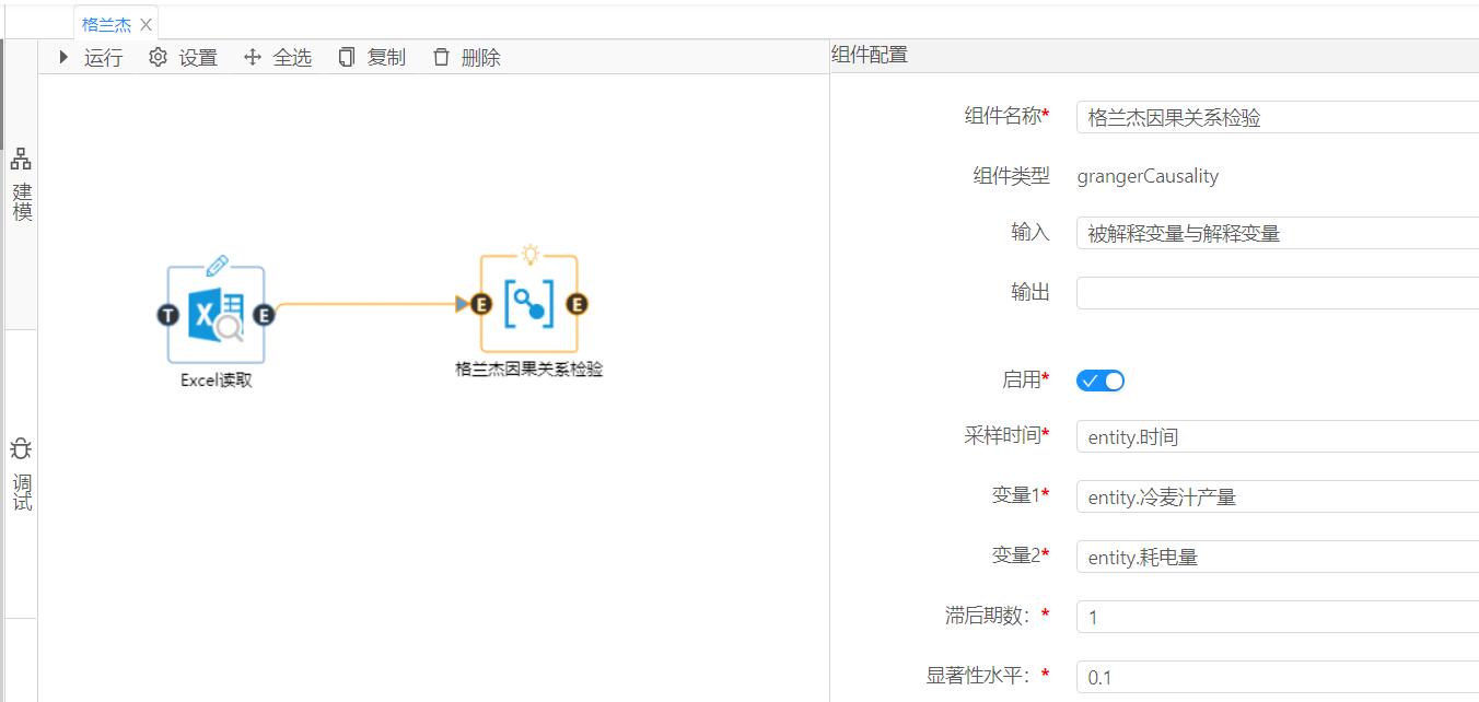 首先,從數(shù)據(jù)大腦中的組件面板搜索格蘭杰因果關(guān)系檢驗(yàn)組件,拖到到工作面板,配置數(shù)據(jù)及組件參數(shù):滯后期數(shù)選擇1,顯著性水平選擇0.1,點(diǎn)擊運(yùn)行。過程如圖1:
