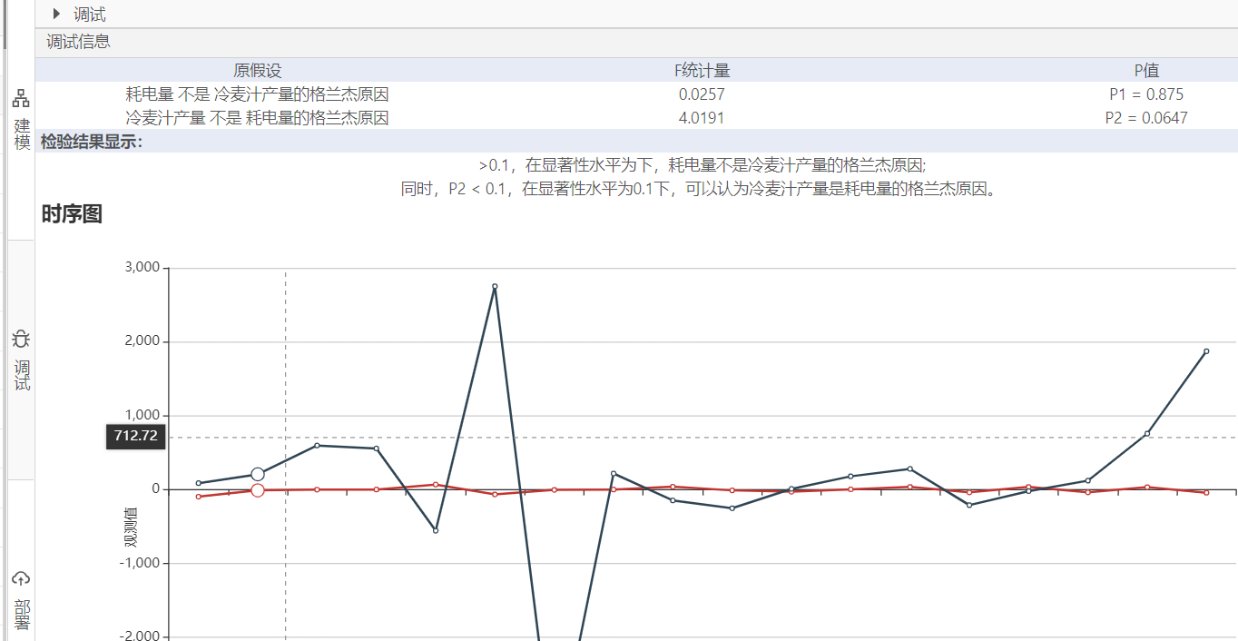 下表是某啤酒企業(yè)2005-2009年各個(gè)季度冷麥汁的產(chǎn)量和制冷耗電量的數(shù)據(jù),該時(shí)間序列數(shù)據(jù)經(jīng)過差分處理是平穩(wěn)的,符合格蘭杰因果檢驗(yàn)的前提。利用AIC信息準(zhǔn)則確定最優(yōu)階數(shù)是1,接下來將使用國工數(shù)據(jù)大腦已經(jīng)集成好的格蘭杰因果關(guān)系檢驗(yàn)算法對(duì)數(shù)據(jù)進(jìn)行雙向因果關(guān)系檢驗(yàn),即檢驗(yàn)冷麥汁的產(chǎn)量是否為制冷耗電量的格蘭杰原因及制冷耗電量是否為冷麥汁產(chǎn)量的格蘭杰原因。