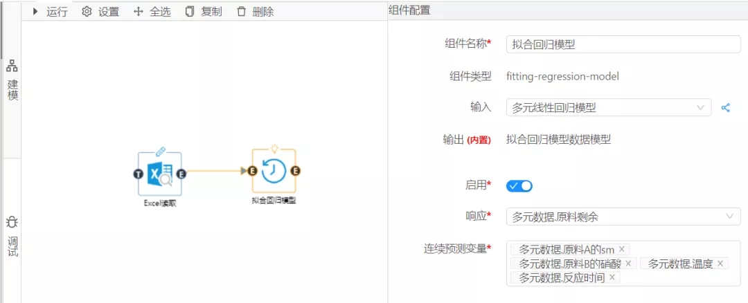 首先,利用數(shù)據(jù)大腦中的多元線性回歸組件,就可得到回歸系數(shù):a1,a2,a3,a4的值。即把多元線性回歸組件拖到到工作面板,配置數(shù)據(jù)及組件參數(shù):將因變量和4個自變量分別拖到對應的區(qū)域。過程如圖1: