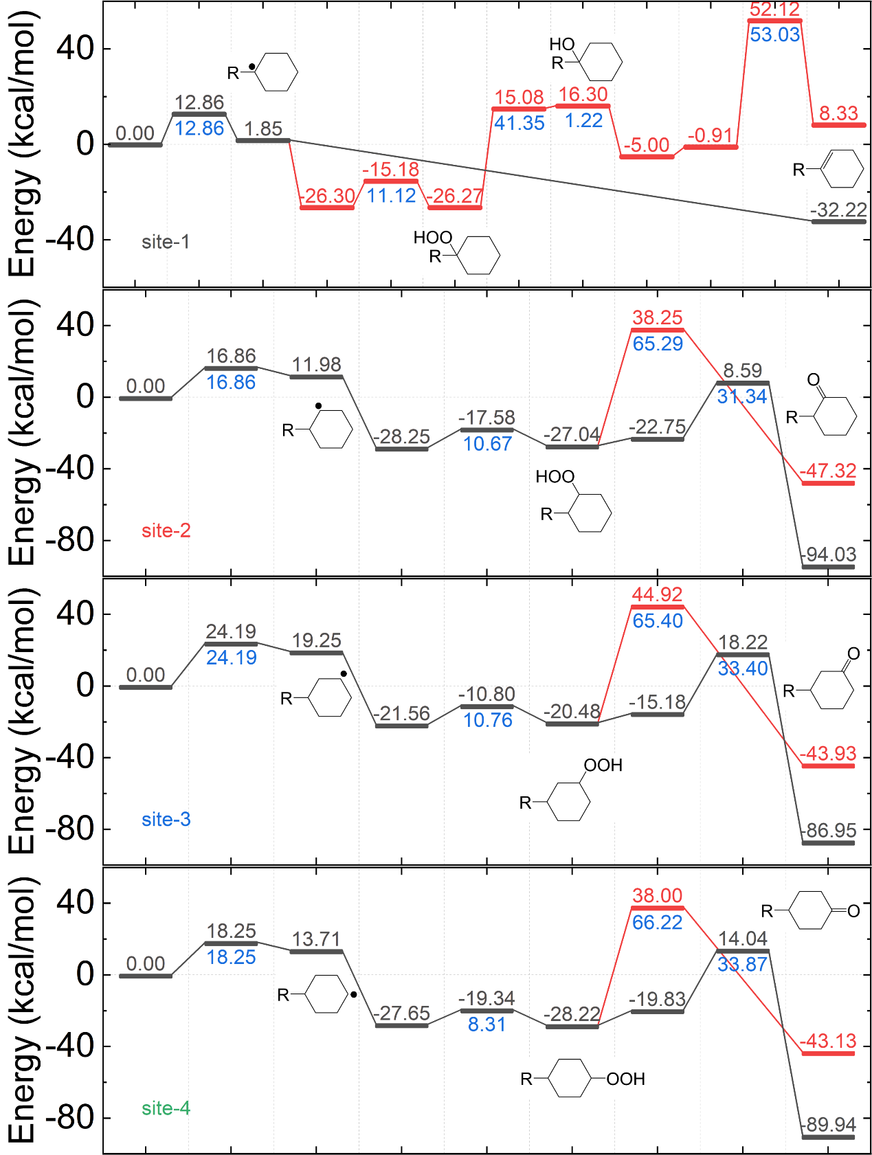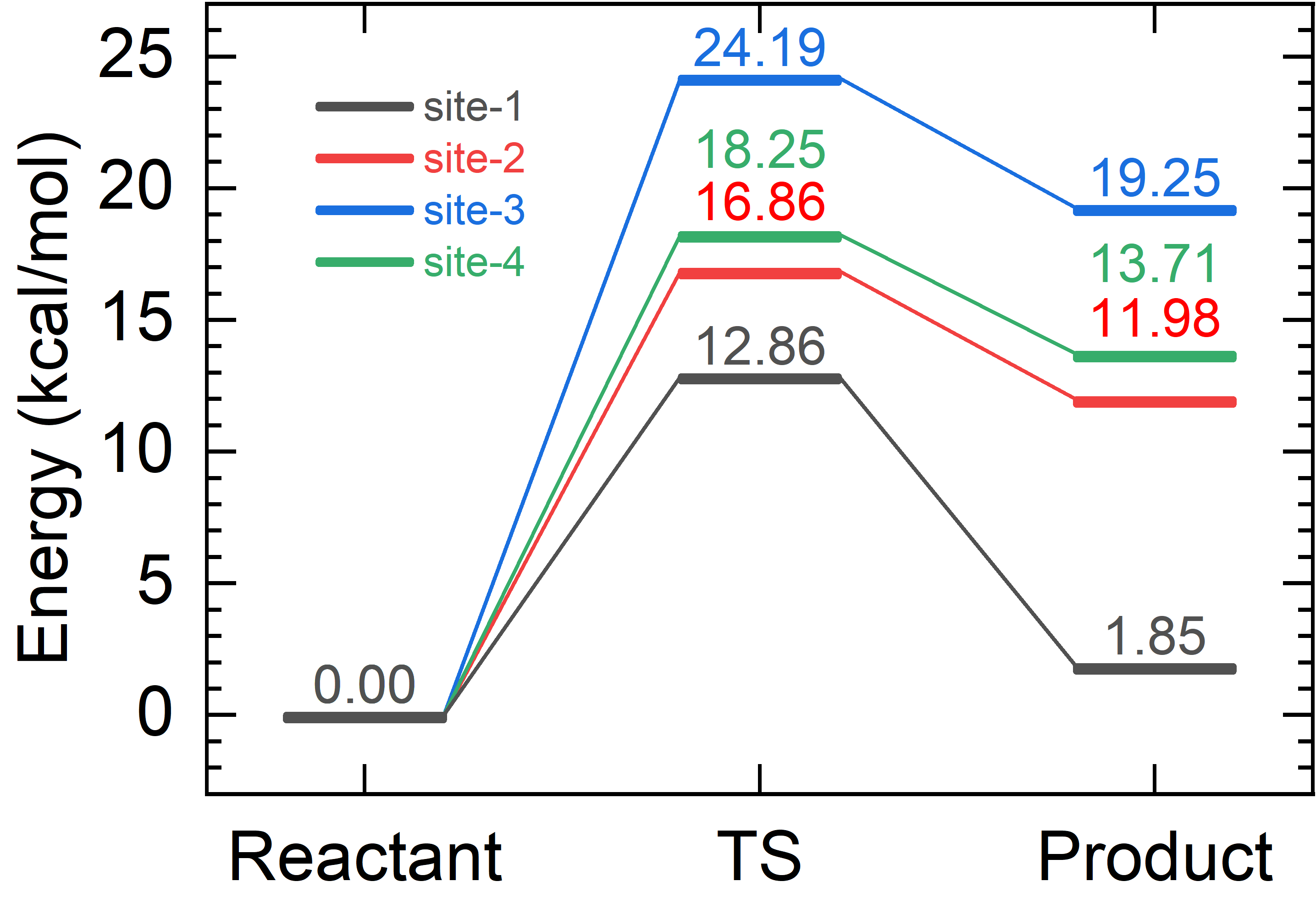 通過計算第一步反應(底物A反應生成B,C和D)的勢能變化,就已經能夠對這一實驗結果做定性解釋,如圖2所示。可以明顯看出,1號位點(圖2黑線)發生的反應作為主反應,有著最低的反應能壘和最穩定的產物結構。而實驗中未檢測到3號位點(圖2藍線)對應的產物,也與其顯著較高的反應能壘(約是主反應的2倍)以及較差的產物穩定性高度一致。而2號(圖2紅線)和4號位點(圖2綠線)的反應能壘及其產物穩定性介于上述二者之間,也能夠與實驗相符合。