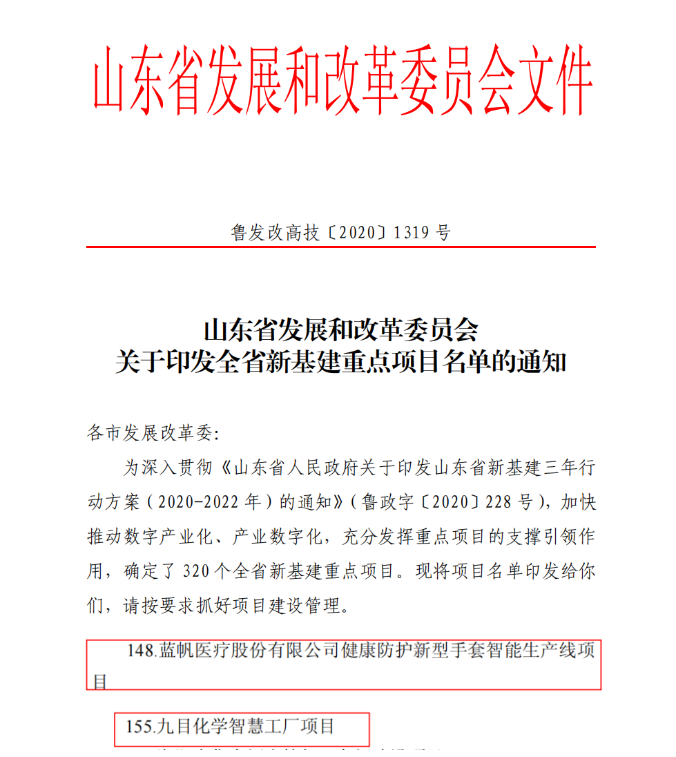 近日,山東省發展和改革委員會印發了全省新基建重點項目名單的通知,其中由國工智能負責承建的兩個智慧工廠項目被列為山東省新基建重點項目,分別是藍帆醫療股份有限公司健康防護新型手套智能生產線項目和九目化學智慧工廠項目。