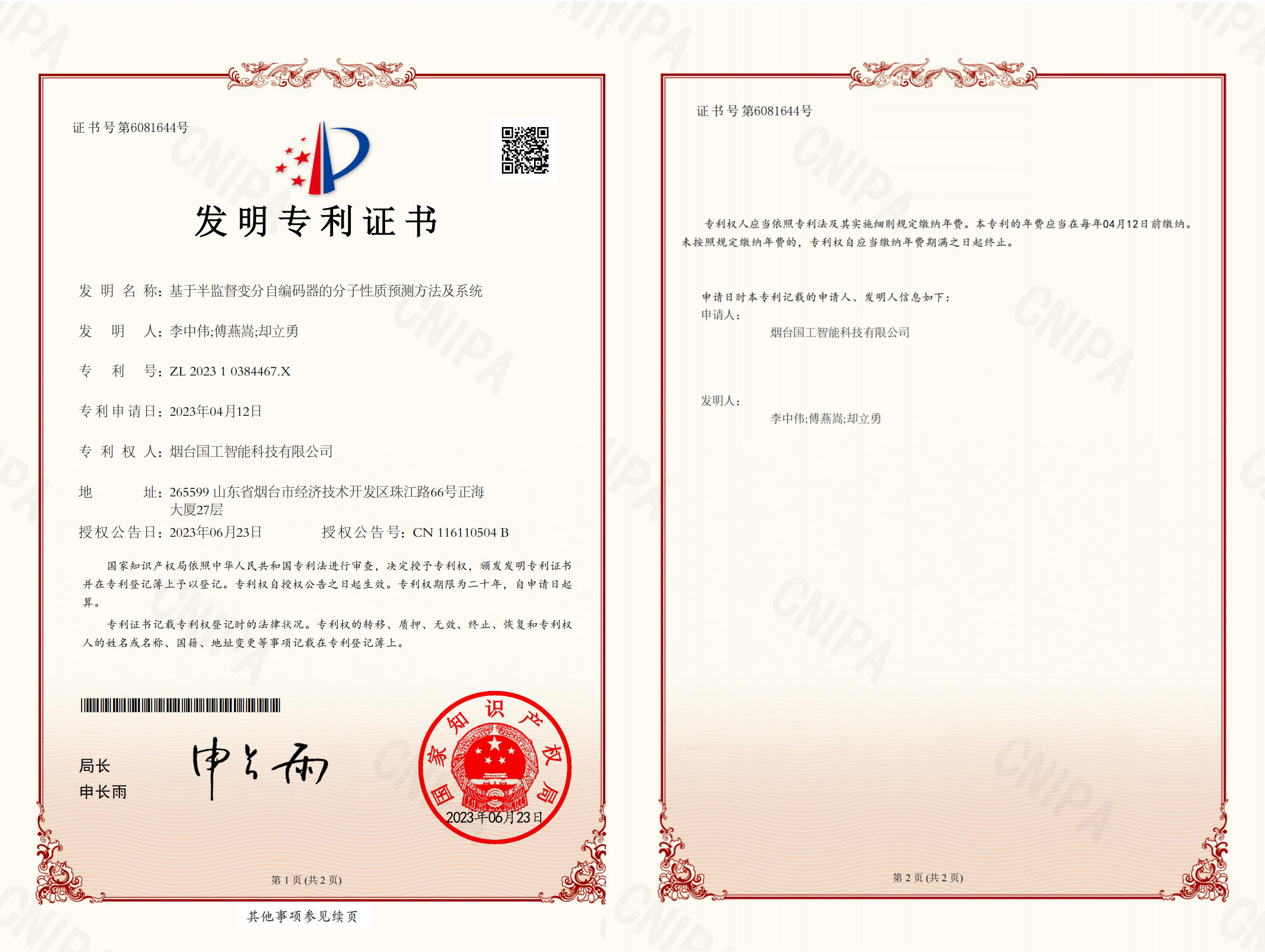 近日,國工智能新添國家知識(shí)產(chǎn)權(quán)局頒發(fā)的一項(xiàng)發(fā)明專利證書“ 基于半監(jiān)督變分自編碼器的分子性質(zhì)預(yù)測(cè)方法及系統(tǒng)”,這有力體現(xiàn)了國工在人工智能技術(shù)領(lǐng)域的核心競爭力。