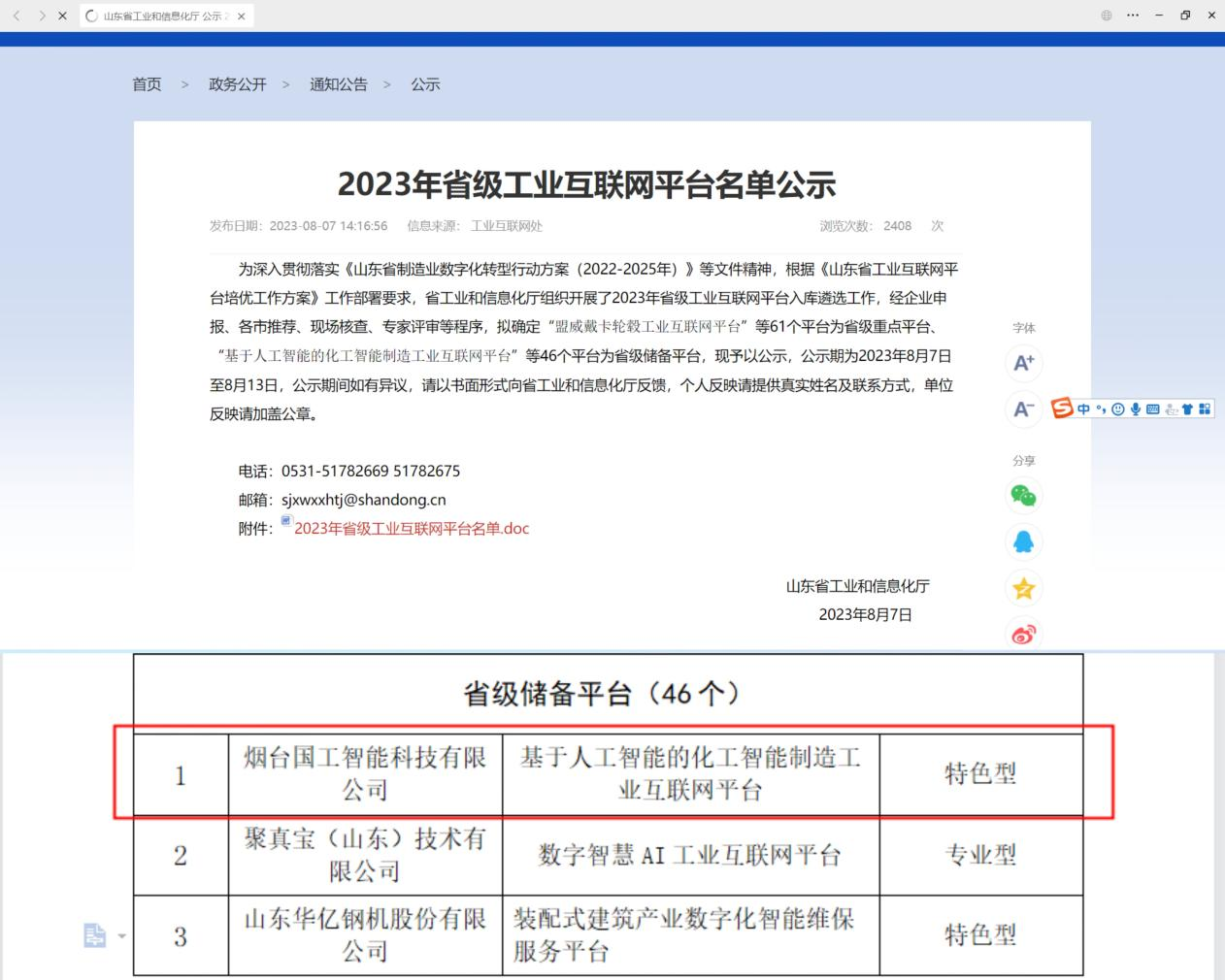 省工業(yè)和信息化廳組織開展了2023年省級工業(yè)互聯(lián)網(wǎng)平臺入庫遴選工作,經(jīng)企業(yè)申報、各市推薦、現(xiàn)場核查、專家評審等程序,擬確定61個平臺為省級重點平臺、46個平臺為省級儲備平臺,國工智能“基于人工智能的化工智能制造工業(yè)互聯(lián)網(wǎng)平臺 ”入選為省級儲備平臺。