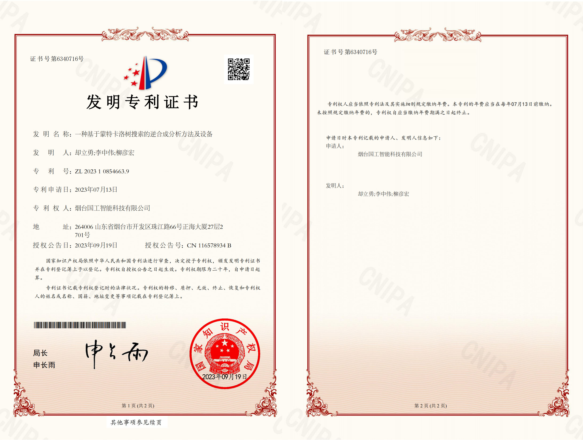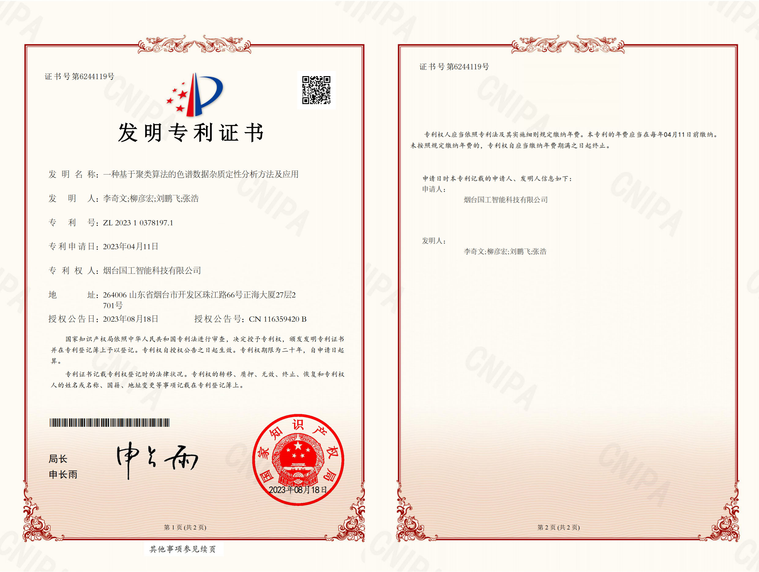近日,國工智能喜添國家知識產權局頒發的兩項發明專利證書“一種基于聚類算法的色譜數據雜質定性分析方法及應用”和“一種基于蒙特卡洛樹搜索的逆合成分析方法及設備”。