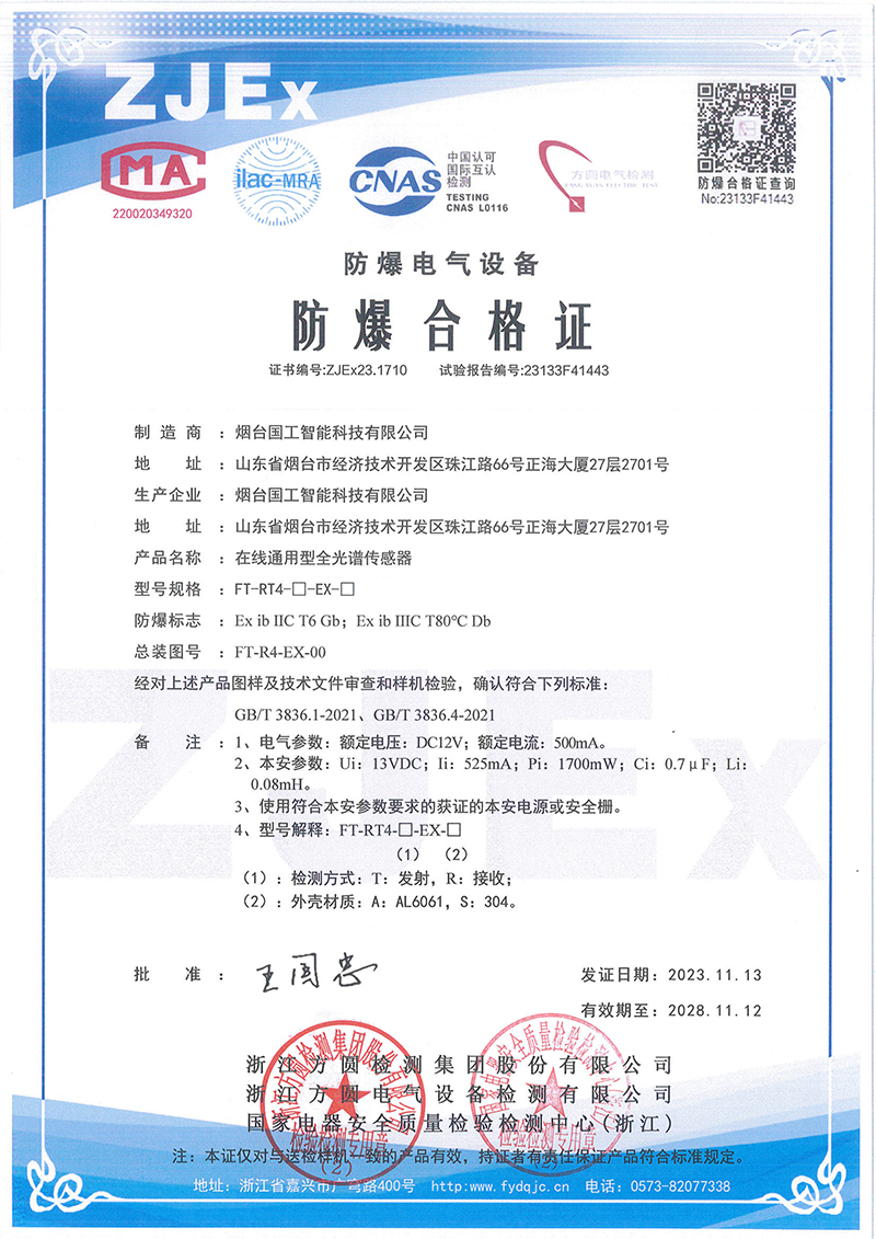 近日,國工智能的全光譜傳感器系列產品:“在線流通式全光譜傳感器”,“在線通用型全光譜傳感器”拿下“本安型防爆合格證。